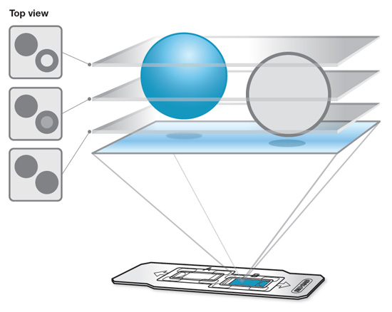 | 將樣品加載到載玻片上。 | 將載玻片插入 TC20 細胞計數器;計數自動開始。 | 在 30 秒內獲取細胞總數(不使用臺盼藍)或總細胞和活細胞計數(使用臺盼藍)。 |